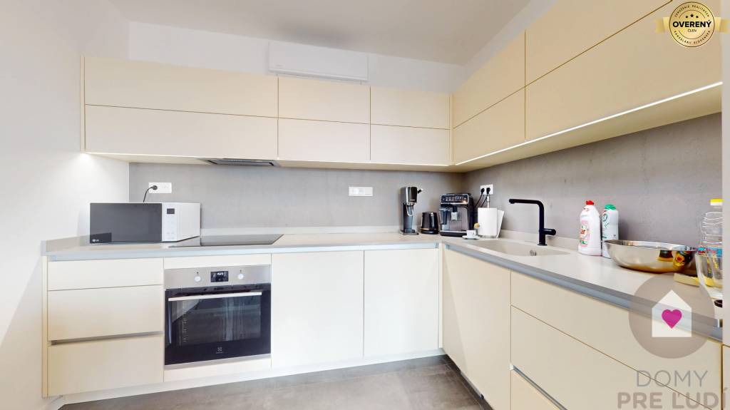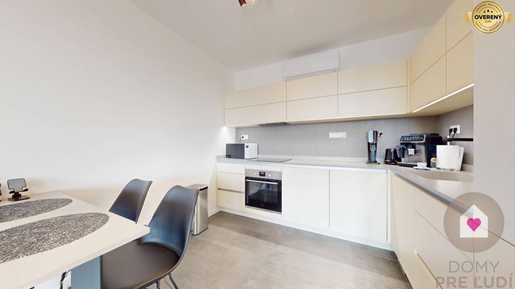 - kuchynskej časti pozostávajúcej z kompletne vybavenej kuchynskej linky so zabudovanými spotrebičmi - indukčná varná doska, digestor, elektrická rúra, umývačka riadu, chladnička s mrazničkou,
