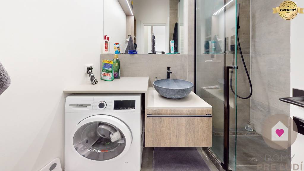 - kúpeľne so sprchovým kútom, umývadlom, skrinkovou zostavou, zrkadlom a práčkou,