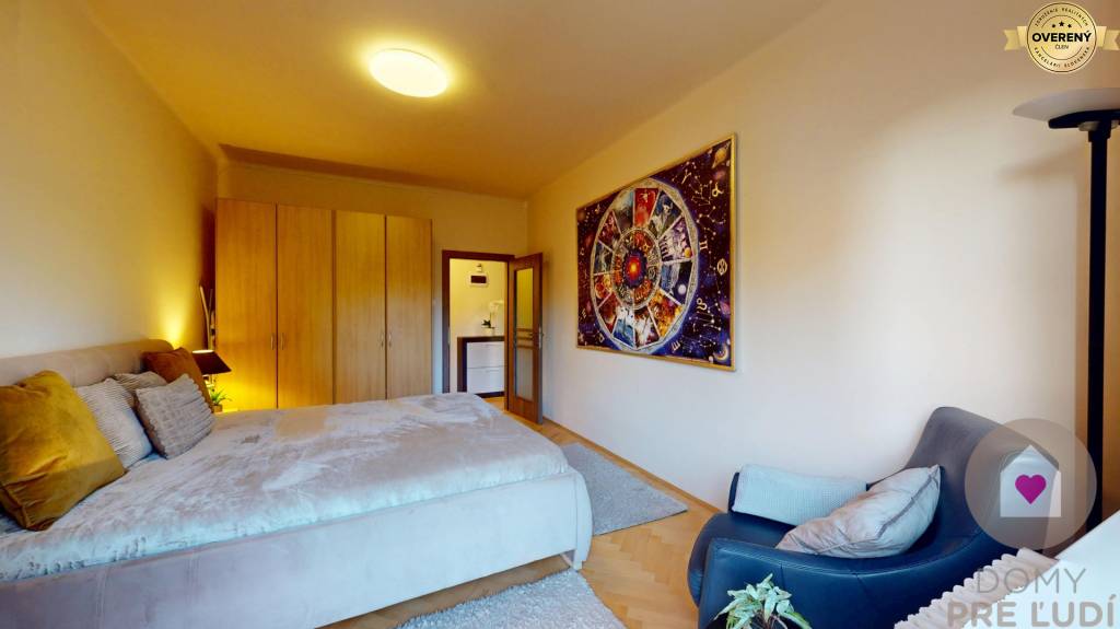 - priestrannou spálňou s manželskou posteľou s matracom, 2 x nočným stolíkom, kreslom, stojacou lampou a 3 šatníkovými skriňami. Vychádza sa z nej na balkón orientovaný do tichého vnútrobloku s množstvom zelene , ktorý zväčšuje plochu bytu o 4,2 m2,