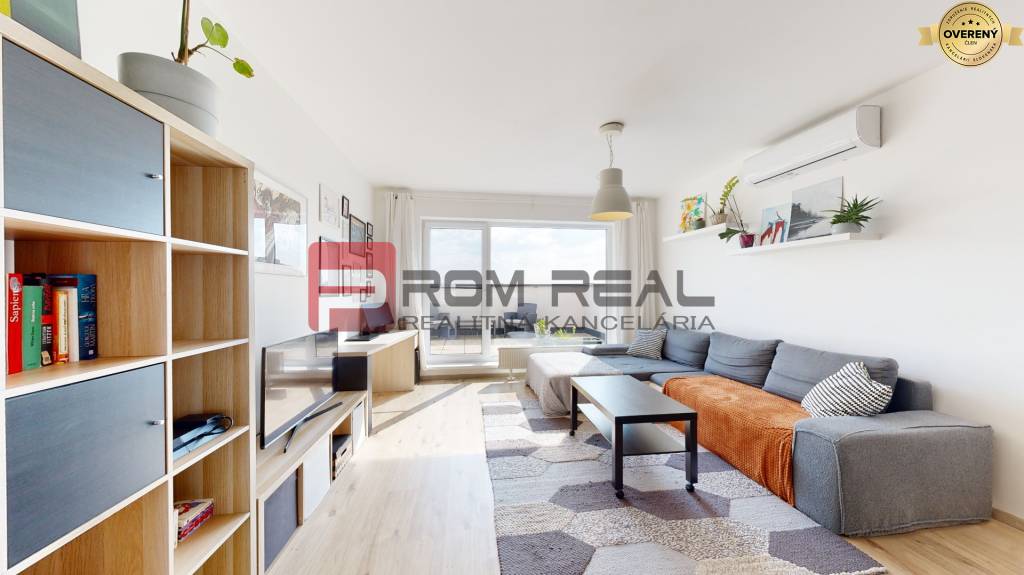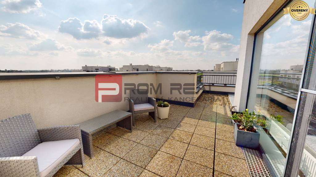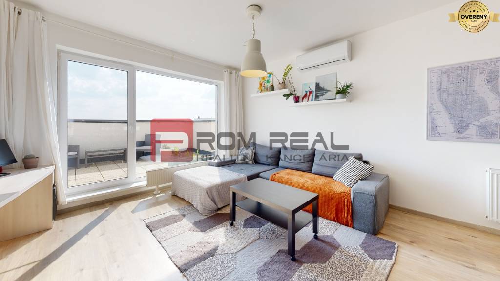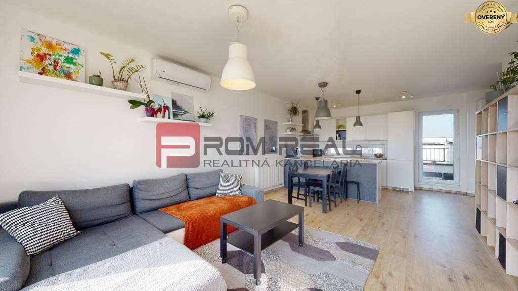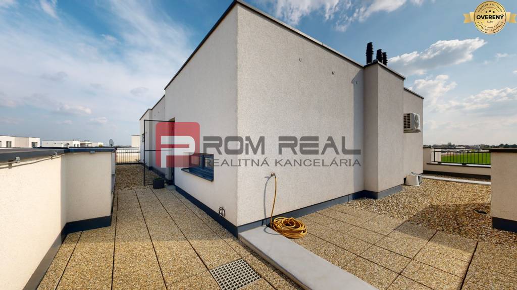 Úžitková plocha bytu je 81,05m2 a plocha terasy je 88m2 (z toho úžitková – vydláždená plocha terasy je 62m2). Pozostáva zo vstupnej haly, ktorá je z ľavej strany napojená na spoločný priestor kuchyne, jedálne a obývačky. Z pravej strany je napojená na chodbu, z ktorej sú sprístupnené izby, kúpeľňa, samostatné WC a priestor ktorý je možné využiť na ako úložný priestor. Zo všetkých miestností je prístup na terasu. Hlavná terasa je orientovaná na juh a má voľný výhľad na okolie. Vykurovanie a ohrev TÚV sú zabezpečené vlastným plynovým kondenzačným kotlom. Mesačné náklady na domácnosť pre 3 osoby sú 65€ + energie (elektrika a plyn) podľa spotreby. Byt je predávaný ako kompletne zariadený (okrem TV a práčky), vrátane exteriérového nábytku. Stavba bytového domu je tehlová a zateplená.