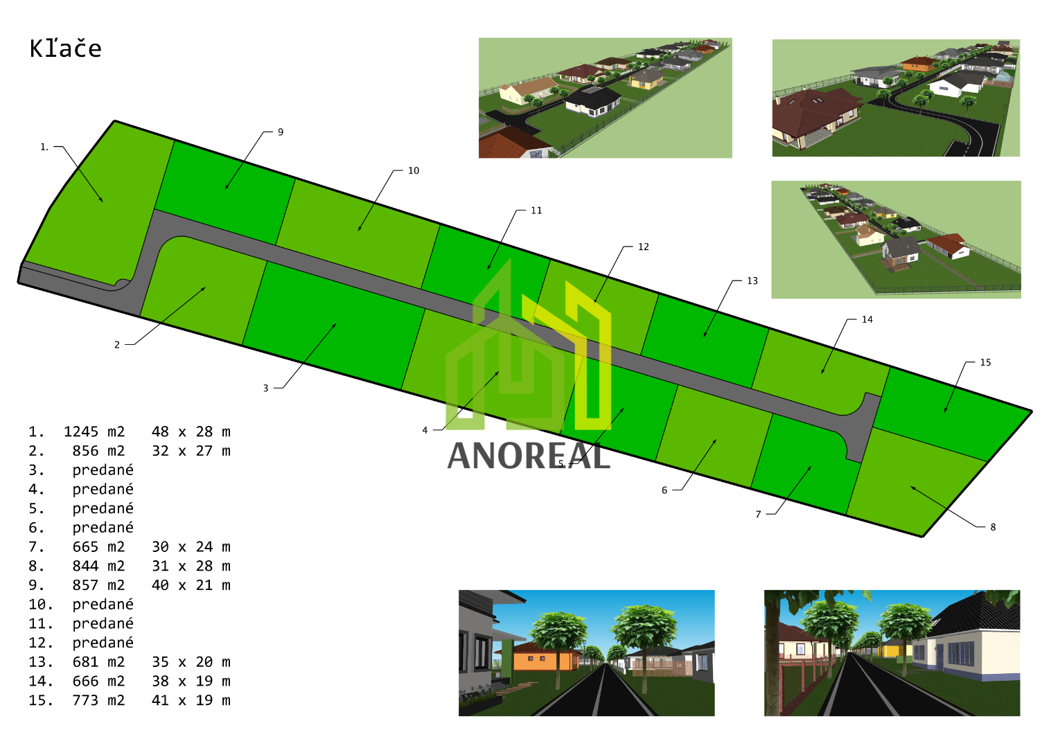AnoReal: EXKLUZÍVNE iba u nás na predaj 12 stavebných pozemkov pre rodinné domy, ktoré sa nachádzajú v tichej lokalite v obci Kľače neďaleko kúpeľného mestečka Rajecké Teplice. Stavebné pozemky sú slnečné, na rovine a každý je vybavený vodovodnou a elektrickou prípojkou, optickým káblom. K pozemkom vedie asfaltová komunikácia v šírke 4 m, ktorá má po oboch stranách pásy zelene a prípravu na osvetlenie cesty. Cena je 110 Eur/ m2. Za užívanie a vybudovanie asfaltovej prístupovej komunikácie k pozemku - 8000 Eur. Viac info u nás v RK. Kontakt: 0948 868 682, tatiana.salandra@anoreal.sk