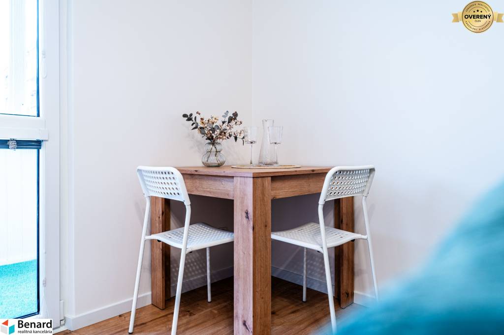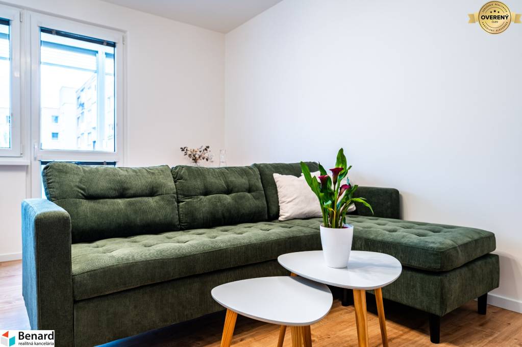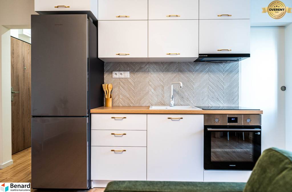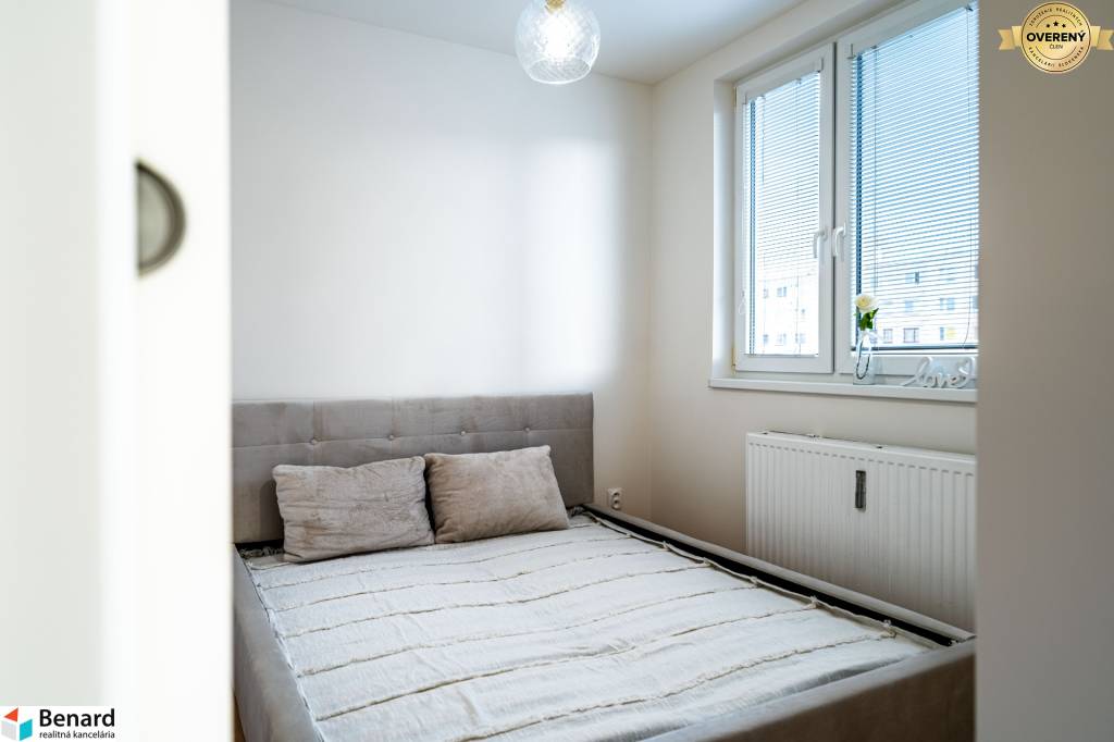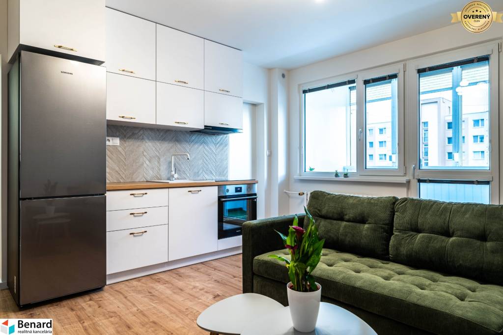 Obývačka s kuchyňou je kompletne zariadená a vybavená. Kuchynská linka je vyrobená na mieru. Nájdete v nej nové spotrebiče (chladnička, digestor, indukčná doska, elektrická rúra) značky Samsung, ktoré sú v záručnej lehote. V obývačke je nová, vkusná sedacia súprava, TV stolík a konferenčný stolík. V spálni je nová posteľ s úložným priestorom. Vďaka šikovne zmenenej dispozícii vznikol v spálni a na chodbe priestor, kde si môžete zriadiť vstavanú skriňu, podľa vlastných predstáv.