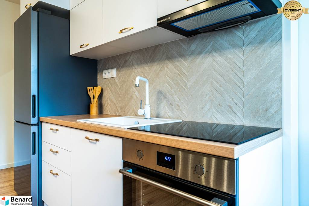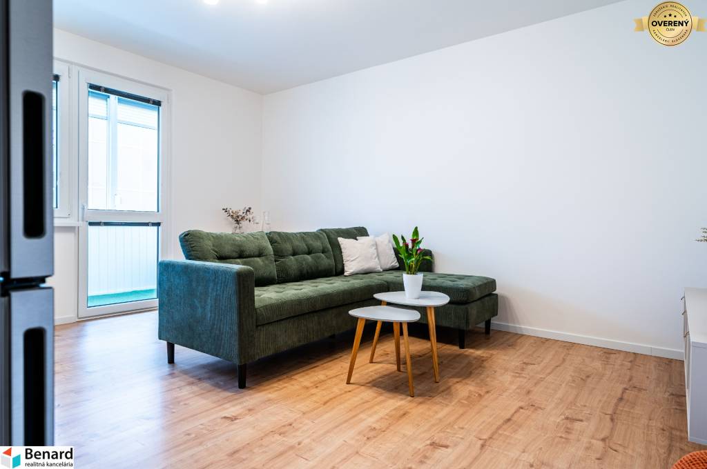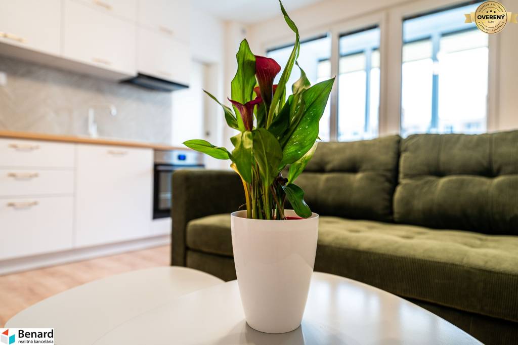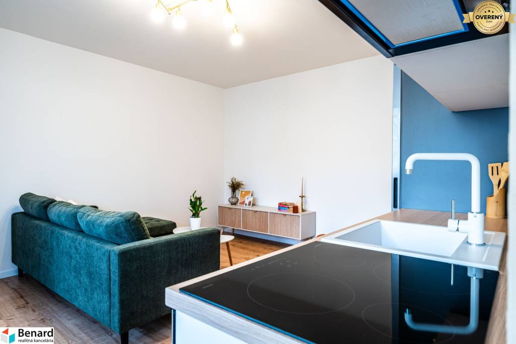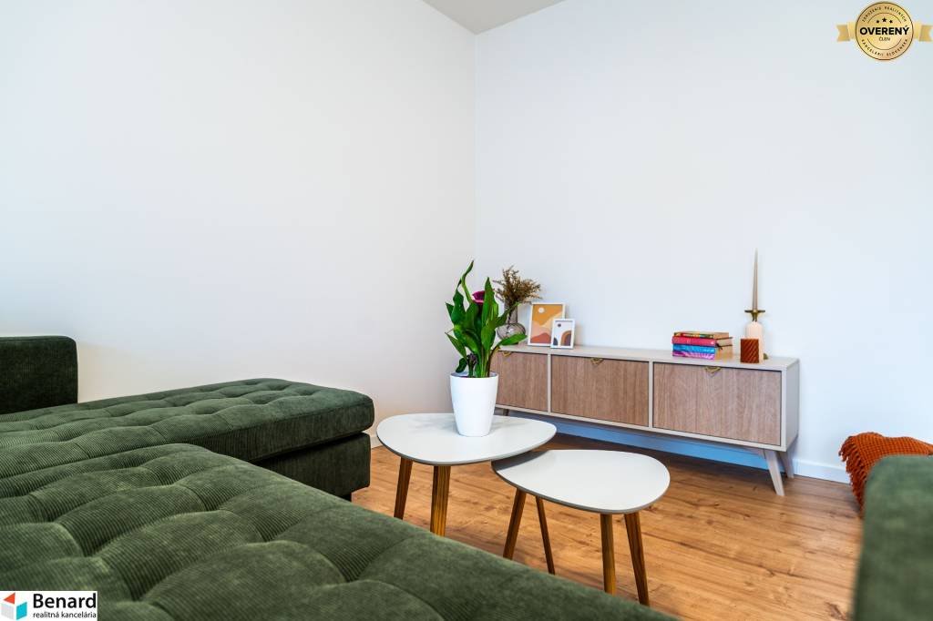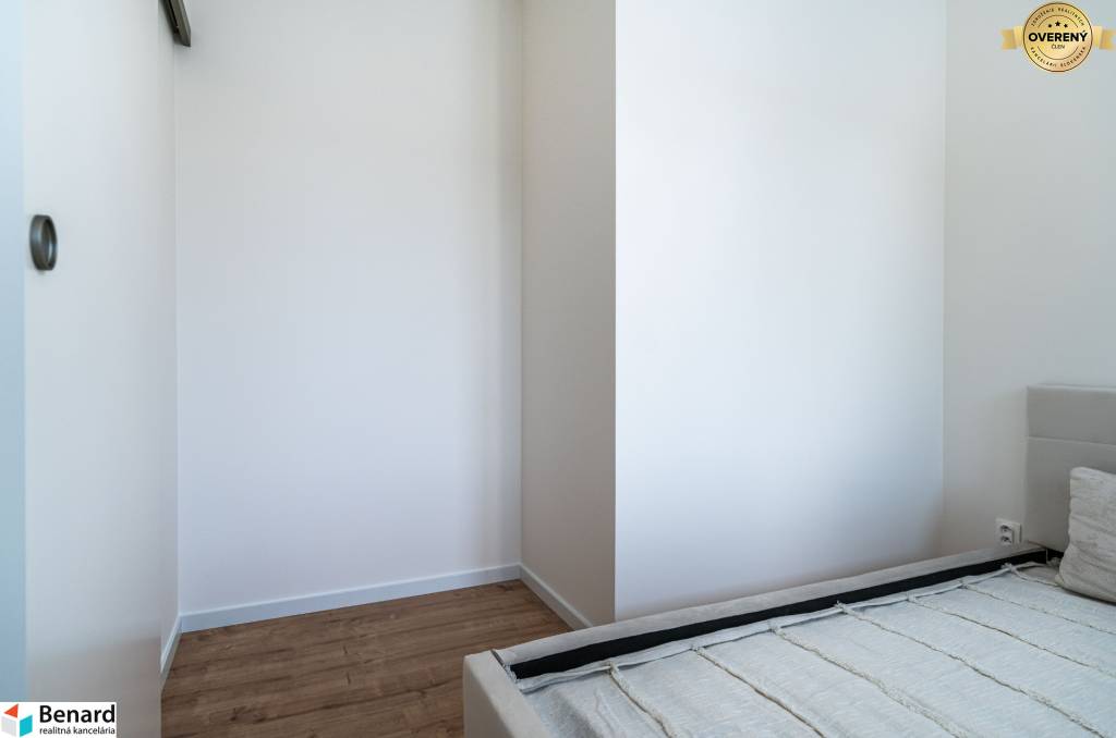 Obývačka s kuchyňou je kompletne zariadená a vybavená. Kuchynská linka je vyrobená na mieru. Nájdete v nej nové spotrebiče (chladnička, digestor, indukčná doska, elektrická rúra) značky Samsung, ktoré sú v záručnej lehote. V obývačke je nová, vkusná sedacia súprava, TV stolík a konferenčný stolík. V spálni je nová posteľ s úložným priestorom. Vďaka šikovne zmenenej dispozícii vznikol v spálni a na chodbe priestor, kde si môžete zriadiť vstavanú skriňu, podľa vlastných predstáv.