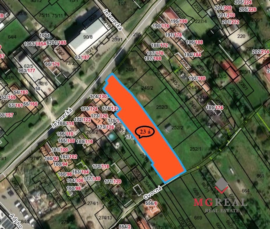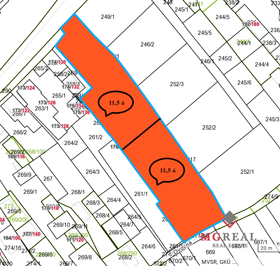 Celková výmera pozemku je 2287 m2, no nakoľko je prístup z dvoch rôznych ulíc je tu možnosť rozdelenia pozemku na dve samostatné parcely o rozlohe zhruba 1150 m2 - každá s vlastným prístupom.