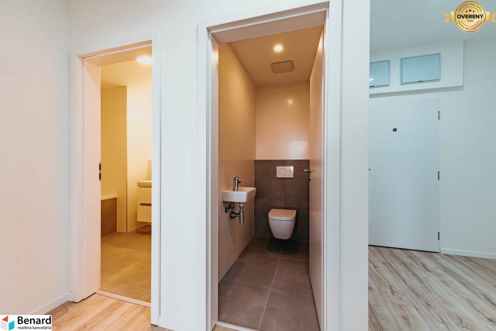 ŠATNÍK: nadštandardným prvkom je aj uzatvorenie šatníkového priestoru vo vstupnej chodbe bytu posuvnými dverami, ktoré sú zahrnuté v cene bytu. Vnútorné vybavenie šatníka si klient zabezpečuje individuálne v zmysle jeho predstáv.