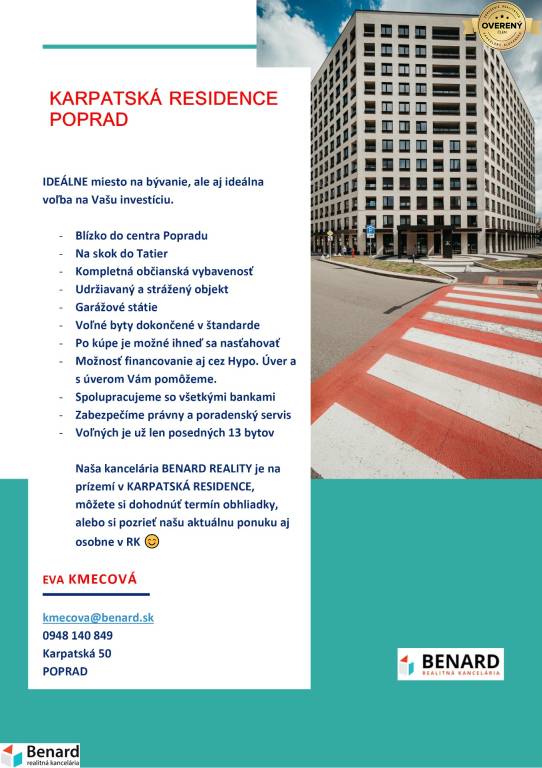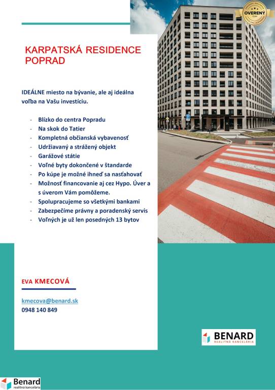 Ak máte záujem o obhliadku, prípadne potrebujete viac informácii, kontaktujte nás na: kmecova@benard.sk, tel.č. 0948 140 849, alebo osobne v realitnom centre na Karpatskej 50.