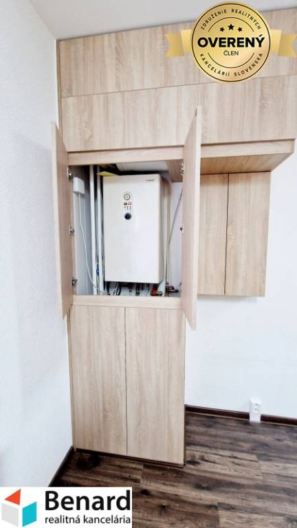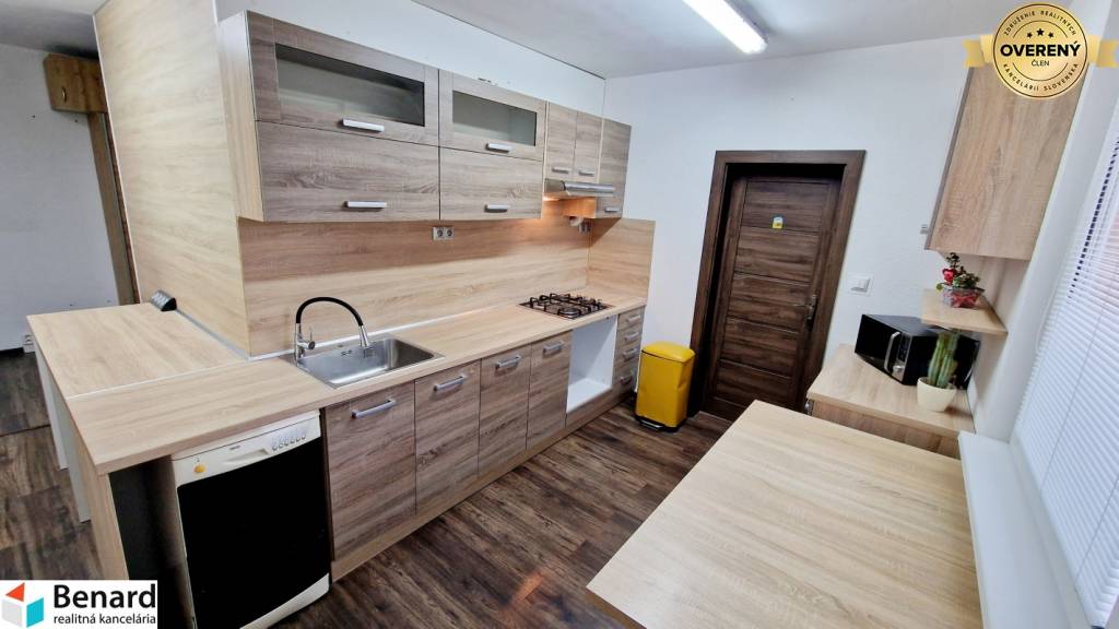 - kuchynská linka: plynový sporák, digestor, pripravený priestor na rúru, práčku a sušičku, potravinová skrinka, kuchynský rozťahovací stôl
