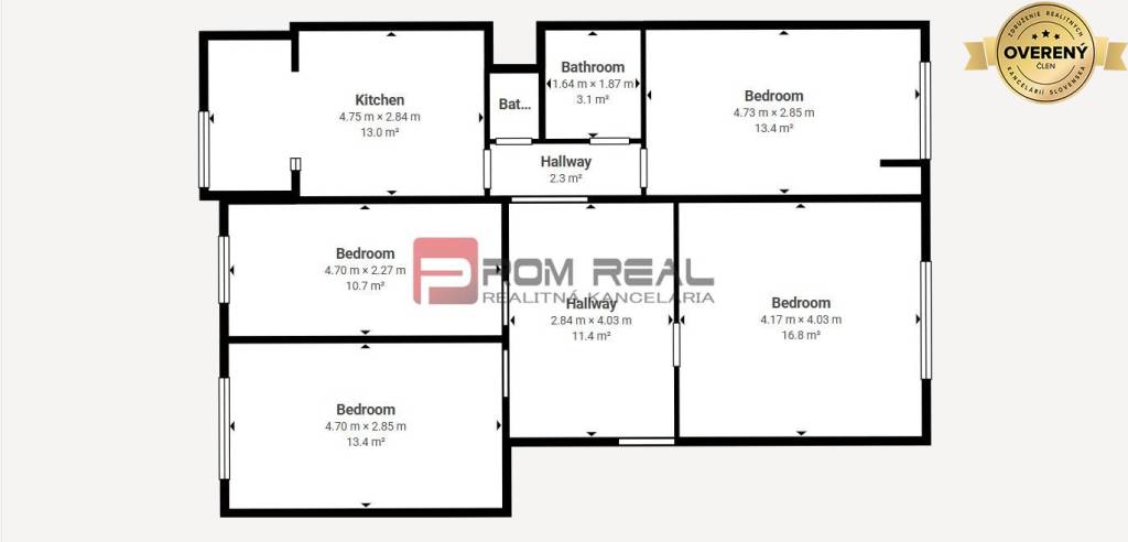 Byt pozostáva z priestrannej vstupnej chodby z ktorej sa po pravej strane vchádza do dvoch väčších izieb a po ľavej strane zasa do jednej väčšej a druhej menšej izby. Oproti chodbe sa nachádza samostatné wc a samostatná kúpeľňa. Za izbami po ľavej strane sa nachádza samostatná oddelená kuchyňa z ktorej je prístup na loggiu.