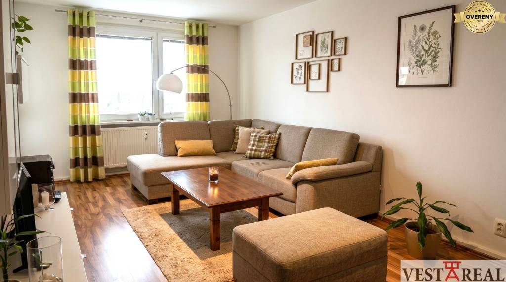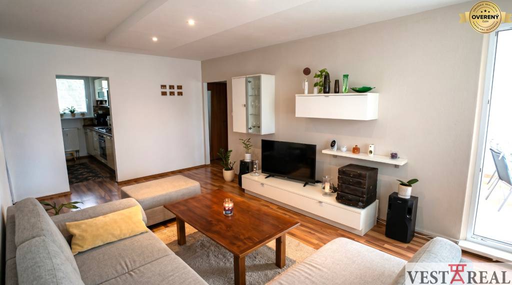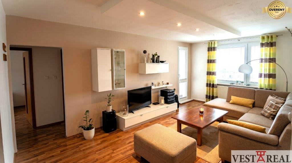 Dispozícia bytu je veľmi praktická a zahŕňa vstupnú chodbu, komoru, kuchyňu, obývaciu izbu, kúpeľňu s vaňou a toaletou a dve samostatné izby. Celková výmera bytu je 69 m² a k bytu prislúcha aj pivnica s rozlohou 2,50 m². Byt je bez tiarch a je k dispozícii ihneď po kúpe. Na jeseň tohto roku je naplánovaná výmena rozvodov v bytovom dome.