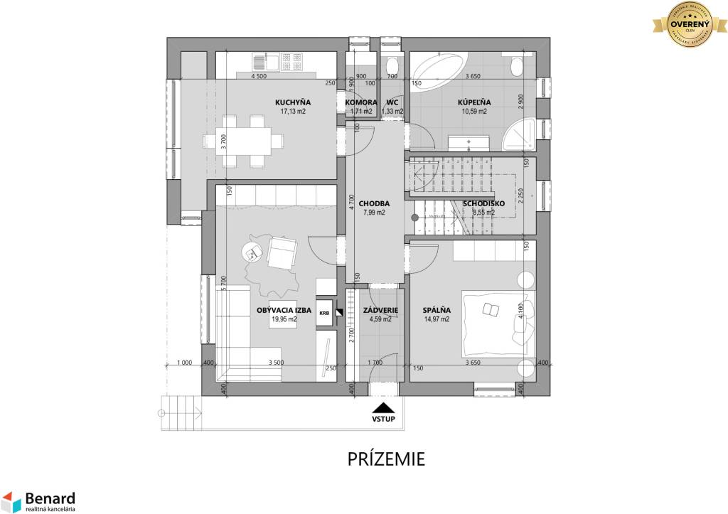 - prízemie tvorí zádverie, chodba, kuchyňa so špajzou, obývačka, spálňa, WC, kúpeľňa s WC o celkovej ploche 77m2;