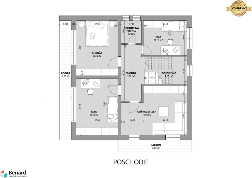 - na poschodí je chodba, 2x izba, spálňa, obývačka, vstup na povalu o celkovej ploche 74m2;